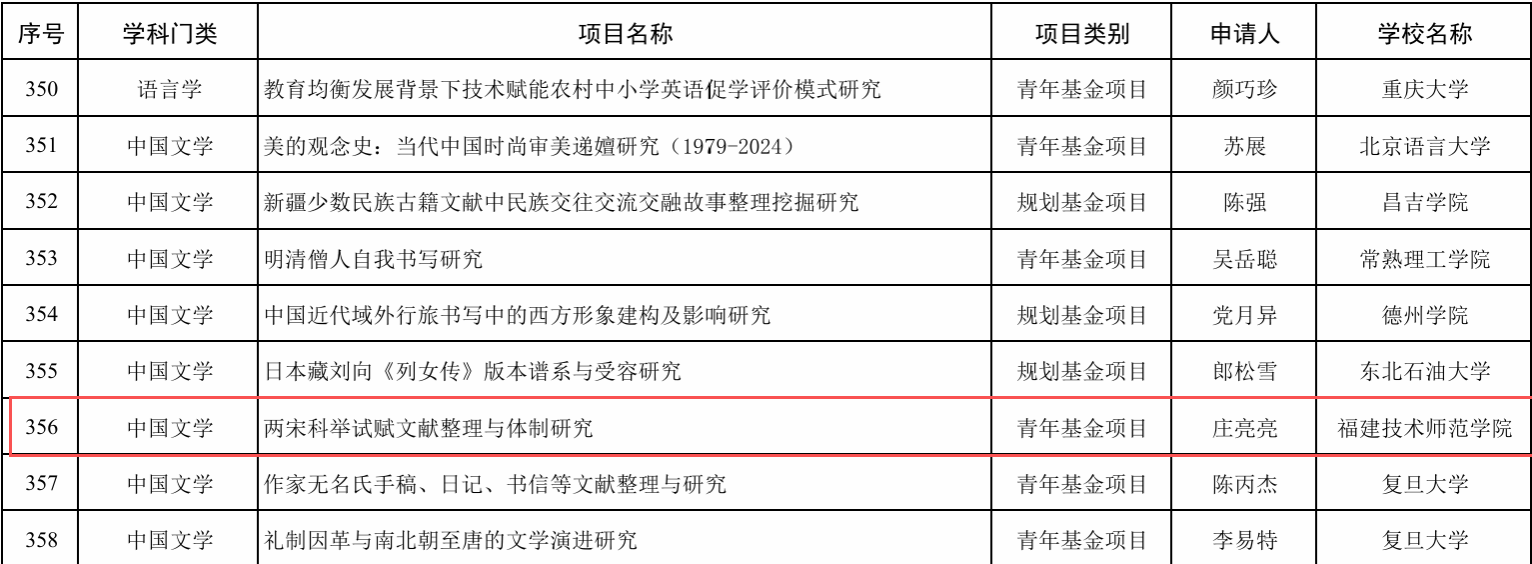 近日,教育部2025年度人文社会科学研究一般项目评审结果公示,我院校友、福建技术师范学院文化与法律学院(海外教育学院)讲师庄亮亮博士申报的课题《两宋科举试赋文献整理与体制研究》获青年基金项目立项,体现了我院人才培养的扎实成效与校友在学术领域的持续深耕。