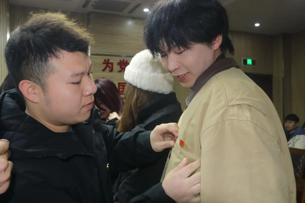 在与会人员的共同见证下,老团员代表为新团员郑重佩戴团徽。闪耀的团徽别在胸前,不仅是一份荣誉,更是一份沉甸甸的责任。