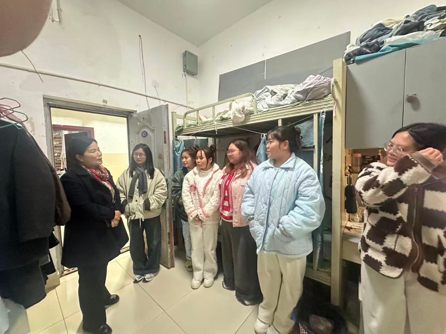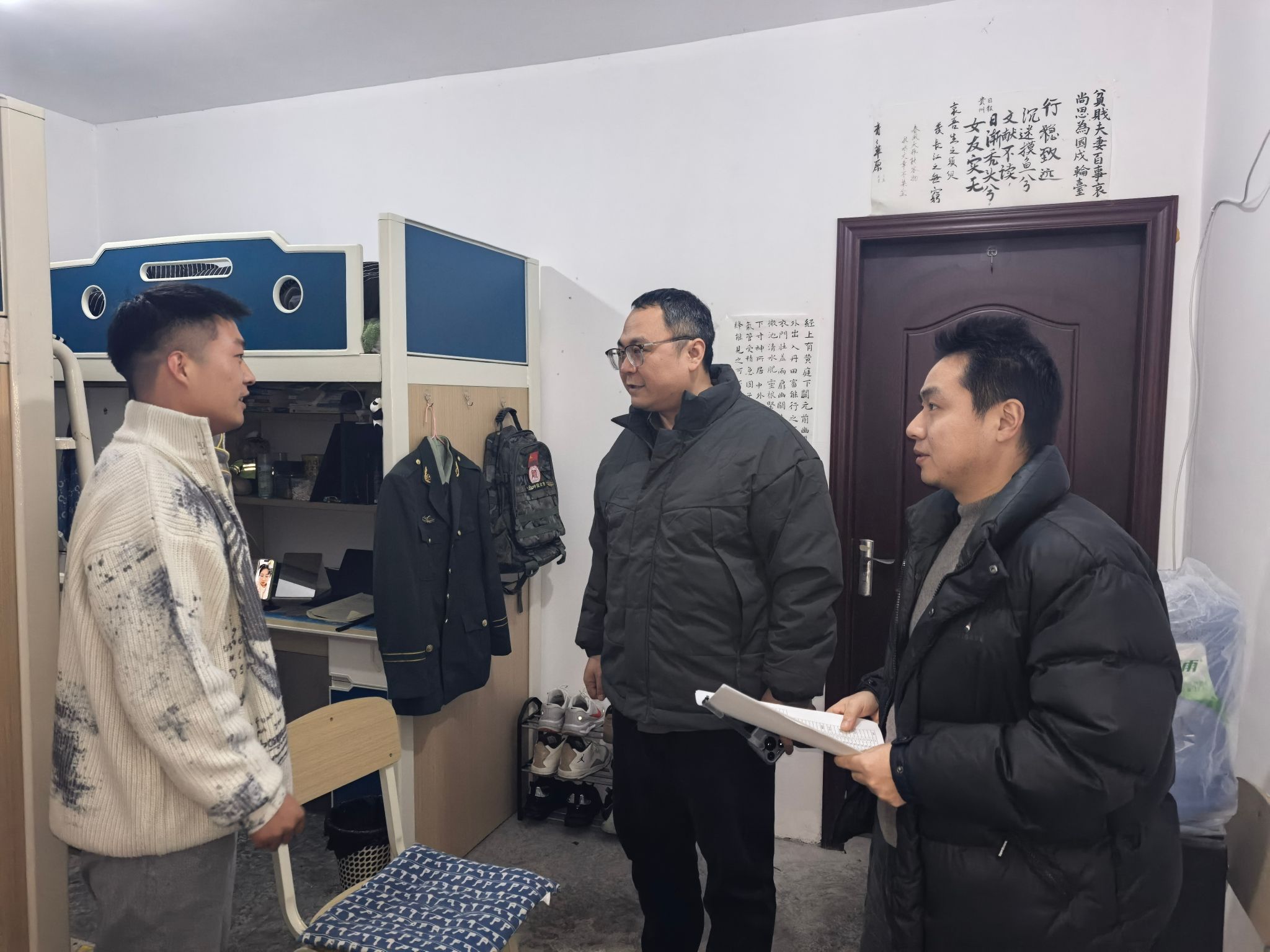 寒假将至,期末考试临近,为切实关心关怀学生,强化学生宿舍安全管理,深入了解学生思想动态与生活情况,营造安全、文明、和谐、健康的学生宿舍环境。学院领导班子成员与全体辅导员于12月24日至25日深入学院两校区学生寝室,开展了集中走访。
